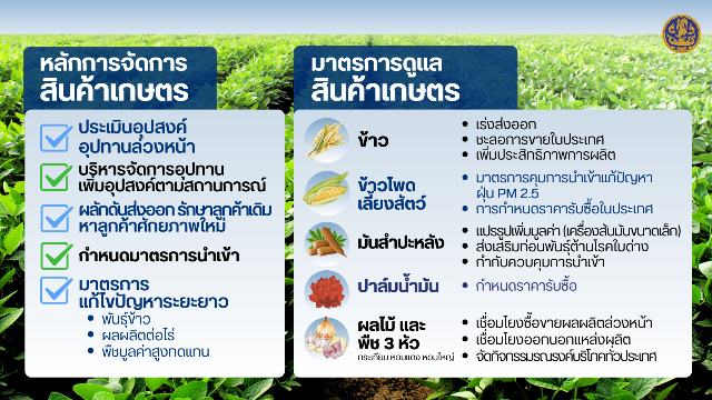 นอกจากการดูแลค่าครองชีพแล้ว DIT ยังมุ่งรักษาเสถียรภาพราคาสินค้าเกษตรที่เป็นหัวใจของเศรษฐกิจฐานราก ข้าวโพดเลี้ยงสัตว์ที่มีปัญหาสำคัญเรื่องการนำเข้าจากพื้นที่เผาและก่อมลพิษ โดยได้กำหนดมาตรการควบคุมการนำเข้าตั้งแต่วันที่ 1 มกราคม 2569 เพื่อยกระดับมาตรฐานสิ่งแวดล้อม ขณะเดียวกันก็ประกันราคารับซื้อที่เกษตรกรพอใจเพื่อให้มีรายได้ที่มั่นคง ส่วนมันสำปะหลัง ได้มีส่งเสริมให้เกษตรกรและกลุ่มวิสาหกิจชุมชนแปรรูปหัวมันสดเป็นมันเส้นเพื่อยืดอายุการเก็บรักษา และสนับสนุนเครื่องจักรเพื่อเพิ่มมูลค่าการผลิต รวมถึงผลักดันการใช้พันธุ์ต้านทานโรคใบด่างและควบคุมการนำเข้าสินค้าคุณภาพต่ำเพื่อปกป้องอุตสาหกรรมมันสำปะหลังไทยไม่ให้ได้รับผลกระทบจากโรคระบาด”