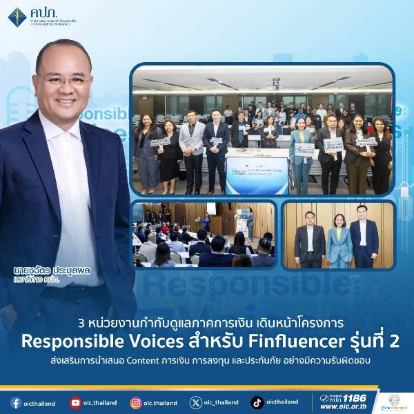วันที่ 1 ตุลาคม 2568 สำนักงานคณะกรรมการกำกับและส่งเสริมการประกอบธุรกิจประกันภัย (คปภ.) สำนักงานคณะกรรมการกำกับหลักทรัพย์และตลาดหลักทรัพย์ (ก.ล.ต.) และธนาคารแห่งประเทศไทย (ธปท.) เปิดโครงการResponsible Voices สำหรับ Finfluencer รุ่นที่ 2” ณ สำนักงาน ก.ล.ต. โดยมีศาสตราจารย์ ดร.พรอนงค์ บุษราตระกูล เลขาธิการ ก.ล.ต. เป็นประธานในพิธี และได้รับเกียรติจากผู้แทนหน่วยงานกำกับทั้ง 3 หน่วยงานเข้าร่วม ซึ่งเป็นการจัดต่อเนื่องจากความสำเร็จอย่างยิ่งใหญ่ของรุ่นที่ 1 ที่สิ้นสุดไปเมื่อเดือนพฤษภาคม 2568 ที่ผ่านมา โดยได้คัดเลือก Financial Influencer (Finfluencer) จำนวน 40 คน จากหลากหลายแพลตฟอร์ม เข้าร่วมอบรมในหัวข้อที่เกี่ยวข้องกับการให้ข้อมูลด้านการเงิน การลงทุน และการประกันภัย