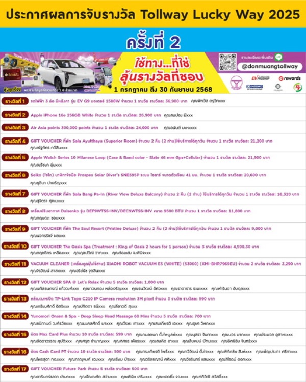 ประกาศรายชื่อผู้โชคดีจากการจับรางวัล ครั้งที่ 2 ประจำเดือนสิงหาคม 2568 Tollway Lucky Way 2025 ใช้ทางที่ใช่…ลุ้นรางวัลที่ชอบ (1 กรกฎาคม – 30 กันยายน 2568)