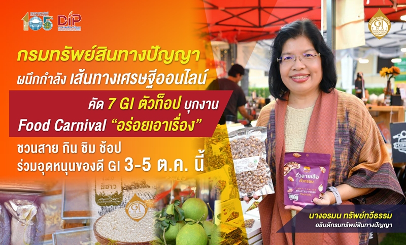 กรมทรัพย์สินทางปัญญา จับมือ สื่อออนไลน์เส้นทางเศรษฐี นำสินค้า GI เข้าร่วมงานเทศกาลอาหาร Food Carnival “อร่อยเอาเรื่อง” พร้อมเชิญชวนสายกิน ชิม ช้อป มาลิ้มลองพิสูจน์ความอร่อยของ 7 สินค้า GI จากเหนือจรดใต้ ระหว่างวันที่ 3 – 5 ตุลาคม 2568 เวลา 12.00 – 21.00 น. ณ มิวเซียมสยาม