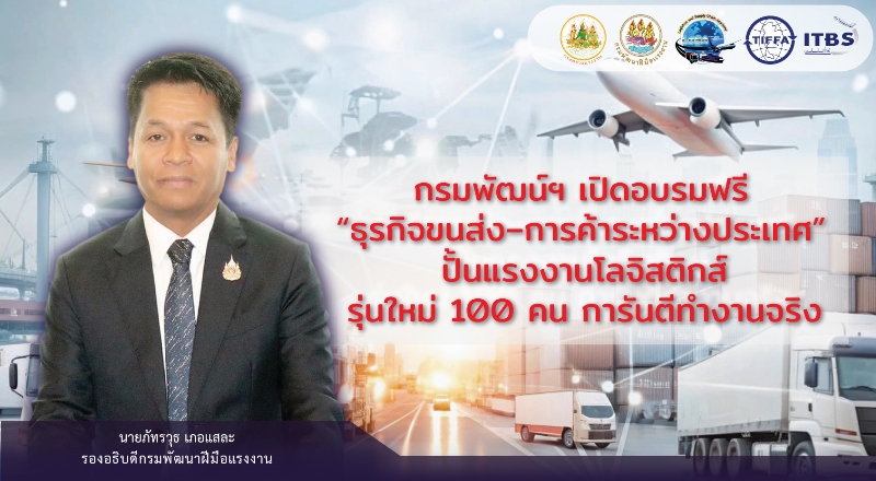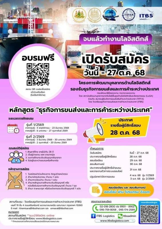 กรมพัฒนาฝีมือแรงงาน โดยสถาบันพัฒนาบุคลากรเทคโนโลยีชั้นสูงด้านโลจิสติกส์และซัพพลายเชน (LoSA) ร่วมกับสมาคมผู้รับจัดการขนส่งสินค้าระหว่างประเทศ (TIFFA) โดยโรงเรียนธุรกิจการขนส่งและการค้าระหว่างประเทศ (ITBS) เปิดรับสมัครผู้สนใจเข้าร่วมอบรม หลักสูตรธุรกิจการขนส่งและการค้าระหว่างประเทศ ภายใต้โครงการพัฒนาบุคลากรด้านโลจิสติกส์รองรับธุรกิจขนส่งและการค้าระหว่างประเทศ ระยะเวลา 240 ชั่วโมง ตั้งแต่บัดนี้ ถึง 27 ตุลาคม 2568 อบรมฟรี ได้ทำงานจริง