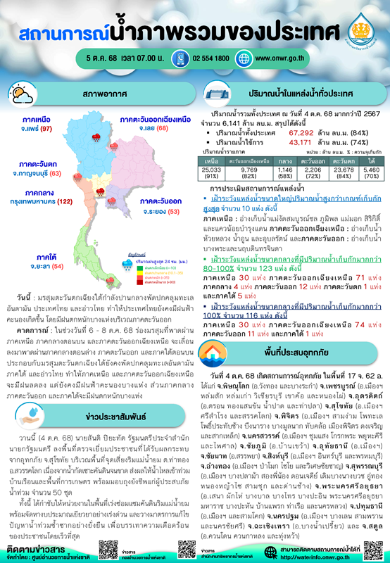 สถานการณ์น้ำภาพรวมของประเทศ วันที่ 5 ต.ค. 68 เวลา 7.00 น.