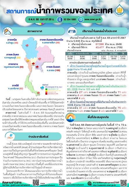 4. พื้นที่ประสบอุทกภัย : วันที่ 5 ต.ค. 68 เกิดสถานการณ์อุทกภัย ในพื้นที่ 17 จ. 73 อ. ได้แก่ จ.พิษณุโลก (อ.วังทอง และบางระกำ) จ.เพชรบูรณ์ (อ.เมืองฯ หล่มสัก หล่มเก่า วิเชียรบุรี เขาค้อ และหนองไผ่) จ.อุตรดิตถ์ (อ.ตรอน ทองแสนขัน น้ำปาด เมืองฯ พิชัย และท่าปลา) จ.สุโขทัย (อ.เมืองฯ ศรีสำโรง และสรรคโลก) จ.พิจิตร (อ.เมืองฯ สามง่าม โพทะเล โพธิ์ประทับช้าง บึงนาราง บางมูลนาก ทับคล้อ ดงเจริญ และสากเหล็ก) จ.นครสวรรค์ (อ.เมืองฯ ชุมแสง โกรกพระ พยุหะคีรี และไพศาล) จ.ชัยภูมิ (อ.บ้านเขว้า) จ.อุบลราชธานี (อ.เมืองฯ วารินชำราบ พิบูลมังสาหาร สว่างวีระวงศ์ และตระการพืชผล) จ.อุทัยธานี (อ.เมืองฯ) จ.ชัยนาท (อ.สรรพยา) จ.สิงห์บุรี (อ.เมืองฯ อินทร์บุรี และพรหมบุรี) จ.อ่างทอง (อ.เมืองฯ ป่าโมก ไชโย และวิเศษชัยชาญ) จ.สุพรรณบุรี (อ.เมืองฯ บางปลาม้า สองพี่น้อง ดอนเจดีย์ เดิมบางนางบวช อู่ทอง หนองหญ้าไซ สามชุก และด่านช้าง) จ.พระนครศรีอยุธยา (อ.เสนา ผักไห่ บางบาล บางไทร บางปะอิน พระนครศรีอยุธยา มหาราช บางปะหัน บ้านแพรก ท่าเรือ และนครหลวง) จ.ปทุมธานี (อ.เมืองฯ และสามโคก) จ.นครปฐม (อ.เมืองฯ บางเลน สามพราน และนครชัยศรี) และ จ.ฉะเชิงเทรา (อ.บางน้ำเปรี้ยว)