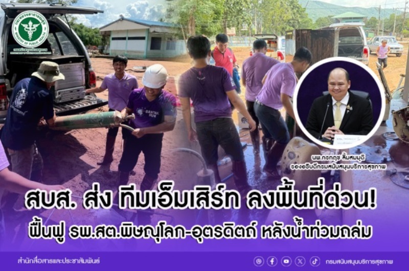 กรมสนับสนุนบริการสุขภาพ (กรม สบส.) กระทรวงสาธารณสุข ส่งทีมปฏิบัติการสนับสนุนระบบบริการสุขภาพในภาวะฉุกเฉิน หรือทีมเอ็มเสิร์ท (Medical Supportive Emergency Response Team : MSERT) ลงพื้นที่จังหวัดพิษณุโลกและอุตรดิตถ์อย่างเร่งด่วน เพื่อสำรวจและฟื้นฟูสถานพยาบาลที่ได้รับความเสียหายจากเหตุอุทกภัย ดินโคลนถล่มให้กลับมาบริการประชาชนได้โดยเร็ว