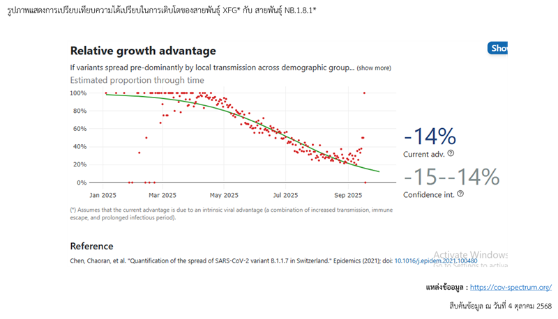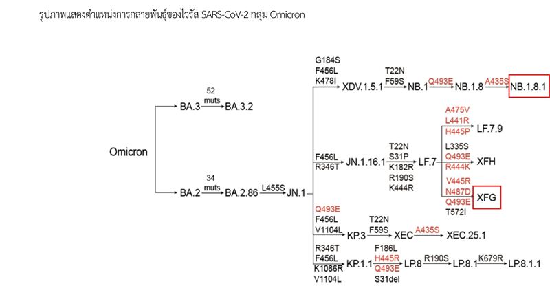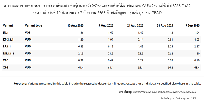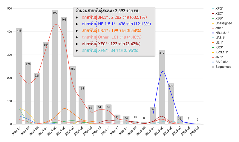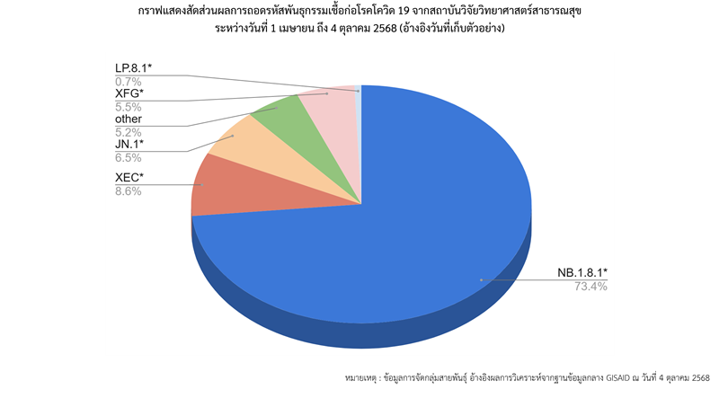 ดร.นพ.สราวุฒิ กล่าวต่ออีกว่า จากการถอดรหัสพันธุกรรมของเชื้อก่อโรคโควิด 19 เพื่อเฝ้าระวังการกลายพันธุ์อย่างต่อเนื่อง ระหว่างวันที่ 1 เมษายน – 4 ตุลาคม 2568 จำนวน 613 ราย พบสายพันธุ์ NB.1.8.1* ร้อยละ 73.4, สายพันธุ์ XEC* ร้อยละ 8.6, สายพันธุ์ JN.1* ร้อยละ 6.5, สายพันธุ์ XFG* ร้อยละ 5.5, และพบสายพันธุ์อื่นๆ ร้อยละ 5.9