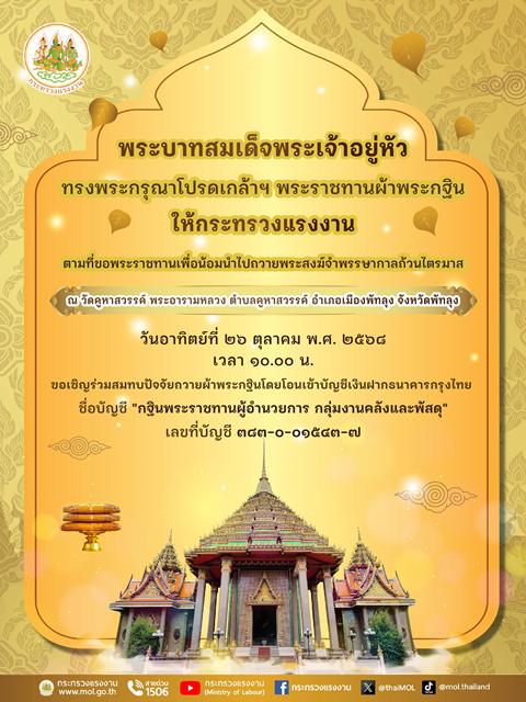 ในโอกาสนี้ กระทรวงแรงงาน จึงขอเชิญชวนพี่น้องผู้ใช้แรงงาน นายจ้าง ผู้ประกันตน และพุทธศาสนิกชน ผู้มีจิตศรัทธา ร่วมบริจาคสมทบปัจจัย ได้ที่บัญชีเงินฝากธนาคารกรุงไทย ชื่อบัญชี กฐินพระราชทานผู้อำนวยการ กลุ่มงานคลังและพัสดุ เลขที่บัญชี 383-0-01543-7 ได้ตั้งแต่บัดนี้จนถึงวันที่ 26 ตุลาคม 2568 เพื่อรวบรวมปัจจัยนำเข้าสมทบถวายบำรุงวัดคูหาสวรรค์ พระอารามหลวง จังหวัดพัทลุง ต่อไป สอบถามเพิ่มเติมได้ที่ โทร. 0 2232 1177 ภายในวัน และเวลาราชการ