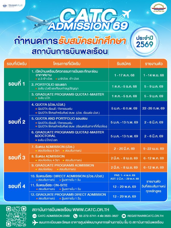 นางสาวภัคณัฏฐ์ มากช่วย ผู้ว่าการสถาบันการบินพลเรือน (สบพ.) เปิดเผยว่า สถาบันการบินพลเรือน มีภารกิจหลักในการผลิตและพัฒนาบุคลากรด้านการบินพลเรือน ในระดับอุดมศึกษาและระดับการฝึกอบรมตามมาตรฐานสากล เพื่อสนับสนุนอุตสาหกรรมการบินทั้งในประเทศและภูมิภาค โดย สบพ. กำหนดจัดกิจกรรม CATC Open House ขึ้นเพื่อเปิดโอกาสให้กลุ่มเป้าหมายได้เข้ามามีประสบการณ์ตรงกับการบริหารจัดการเรียนในแต่ละหลักสูตรของ สบพ. รวมทั้งได้เข้ามาสัมผัสบรรยากาศจริงกับหลักสูตรวิชาภาคพื้นที่เปิดสมัครสอบคัดเลือกบุคคลเข้าศึกษาต่อที่ สบพ. ทั้งอาจารย์ผู้สอน สถานที่เรียน ห้องฝึกปฏิบัติ รวมทั้งสิ่งอำนวยความสะดวกต่างๆ ภายใน สบพ. ในวันศุกร์ที่ 17 ตุลาคม 2568 ณ ห้อง CATC Convention Hall ชั้น 4 อาคารศูนย์พัฒนาบุคลากรด้านการบิน สถาบันการบินพลเรือน กรุงเทพฯ ภายใต้ธีม “Clear for Takeoff เริ่มต้นอาชีพการบินมาตรฐานกับ CATC”