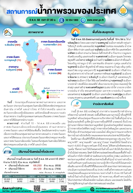 3. พื้นที่ประสบอุทกภัย : วันที่ 8 ต.ค. 68 เกิดสถานการณ์อุทกภัย ในพื้นที่ 19 จ. 94 อ. ได้แก่ จ.พิษณุโลก (อ.วังทอง และบางระกำ) จ.เพชรบูรณ์ (อ.เมืองฯ หล่มสัก หล่มเก่า วิเชียรบุรี เขาค้อ และหนองไผ่) จ.อุตรดิตถ์ (อ.ตรอน ทองแสนขัน น้ำปาด เมืองฯ พิชัย ท่าปลา และลับแล) จ.สุโขทัย (อ.เมืองฯ ศรีสำโรง และสรรคโลก) จ.พิจิตร (อ.เมืองฯ สามง่าม โพทะเล โพธิ์ประทับช้าง บึงนาราง บางมูลนาก ทับคล้อ ดงเจริญ และสากเหล็ก) จ.นครสวรรค์ (อ.เมืองฯ ชุมแสง โกรกพระ พยุหะคีรี และไพศาล) จ.ชัยภูมิ (อ.บ้านเขว้า) จ.ยโสธร (อ.เมืองฯ คำเขื่อนแก้ว ไทยเจริญ ทรายมูล ป่าติ้ว มหาชนะชัย เลิงนกทา กุดชุม และค้อวัง) จ.อุดรธานี (อ.เมืองฯ พิบูลยรักษ์ สร้างคอม หนองหาน บ้านดุง เพ็ญ กุดจับ หนองวัวซอ นายูง และกุมภวาปี) จ.อุบลราชธานี (อ.เมืองฯ วารินชำราบ พิบูลมังสาหาร สว่างวีระวงศ์ และตระการพืชผล) จ.อุทัยธานี (อ.เมืองฯ) จ.ชัยนาท (อ.สรรพยา) จ.สิงห์บุรี (อ.เมืองฯ อินทร์บุรี และพรหมบุรี) จ.อ่างทอง (อ.เมืองฯ ป่าโมก ไชโย และวิเศษชัยชาญ) จ.สุพรรณบุรี (อ.เมืองฯ บางปลาม้า สองพี่น้อง ดอนเจดีย์ เดิมบางนางบวช อู่ทอง หนองหญ้าไซ สามชุก และด่านช้าง) จ.พระนครศรีอยุธยา (อ.เสนา ผักไห่ บางบาล บางไทร บางปะอิน ท่าเรือ พระนครศรีอยุธยา มหาราช บางปะหัน บ้านแพรก และนครหลวง) จ.ปทุมธานี (อ.เมืองฯ และสามโคก) จ.นครปฐม (อ.เมืองฯ บางเลน สามพราน และนครชัยศรี) และ จ.ฉะเชิงเทรา (อ.บางน้ำเปรี้ยว)