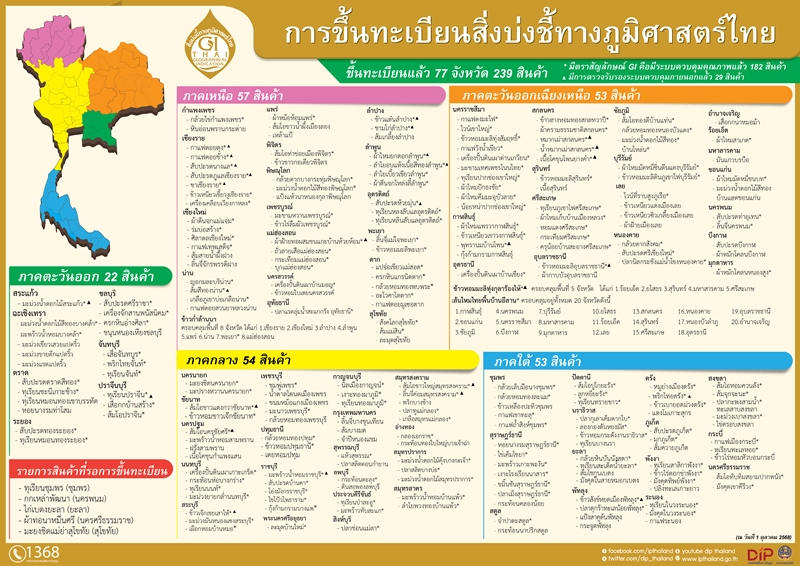 ทั้งนี้ ในปีงบประมาณ พ.ศ. 2568 กรมทรัพย์สินทางปัญญาได้ขึ้นทะเบียนสินค้า GI ไทย 27 รายการ สร้างมูลค่าทางเศรษฐกิจกว่า 6,100 ล้านบาท ทำให้จำนวนสินค้า GI ของไทยในปัจจุบันอยู่ที่ 239 รายการ รวมมูลค่าการตลาดทั้งสิ้น 82,000 ล้านบาท (เพิ่มขึ้นจากปี 2567 ที่มี GI ของไทย 212 รายการ มูลค่าการตลาด 76,000 ล้านบาท) โดยสินค้า GI ที่ทำรายได้ติด Top 10 ในปี 2568 ได้แก่ 1) ทุเรียนหมอนทองเขาบรรทัด (ตราด) 11,047 ล้านบาท 2) ทุเรียนสะเด็ดน้ำยะลา 6,661 ล้านบาท 3) ทุเรียนหมอนทองระยอง 4,886 ล้านบาท 4) ข้าวหอมมะลิดินภูเขาไฟบุรีรัมย์ 4,812 ล้านบาท 5) มะพร้าวทับสะแก (ประจวบคีรีขันธ์) 3,776 ล้านบาท 6) เหล้าแป้ (แพร่) 3,632 ล้านบาท 7) มะขามหวานเพชรบูรณ์