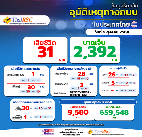 สถานการณ์อุบัติเหตุทางถนนในประเทศไทย วันที่ 9 ตุลาคม 2568 10 ตุลาคม 2025Thailandplusประชาสัมพันธ์ Facebook iconFacebookTwitter iconTwitterLINE iconLineสถานการณ์อุบัติเหตุทางถนนในประเทศไทย วันที่ 9 ตุลาคม 2568