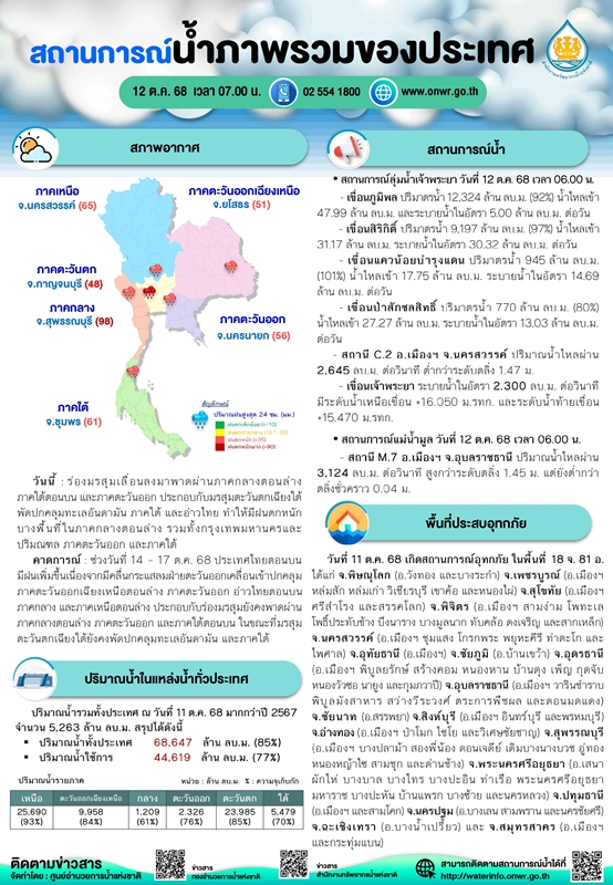 4. พื้นที่ประสบอุทกภัย : วันที่ 11 ต.ค. 68 เกิดสถานการณ์อุทกภัย ในพื้นที่ 18 จ. 81 อ. ได้แก่ จ.พิษณุโลก (อ.วังทอง และบางระกำ) จ.เพชรบูรณ์ (อ.เมืองฯ หล่มสัก หล่มเก่า วิเชียรบุรี เขาค้อ และหนองไผ่) จ.สุโขทัย (อ.เมืองฯ ศรีสำโรง และสรรคโลก) จ.พิจิตร (อ.เมืองฯ สามง่าม โพทะเล โพธิ์ประทับช้าง บึงนาราง บางมูลนาก ทับคล้อ ดงเจริญ และสากเหล็ก) จ.นครสวรรค์ (อ.เมืองฯ ชุมแสง โกรกพระ พยุหะคีรี ท่าตะโก และไพศาล) จ.อุทัยธานี (อ.เมืองฯ) จ.ชัยภูมิ (อ.บ้านเขว้า) จ.อุดรธานี (อ.เมืองฯ พิบูลยรักษ์ สร้างคอม หนองหาน บ้านดุง เพ็ญ กุดจับ หนองวัวซอ นายูง และกุมภวาปี) จ.อุบลราชธานี (อ.เมืองฯ วารินชำราบ พิบูลมังสาหาร สว่างวีระวงศ์ ตระการพืชผล และดอนมดแดง) จ.ชัยนาท (อ.สรรพยา) จ.สิงห์บุรี (อ.เมืองฯ อินทร์บุรี และพรหมบุรี) จ.อ่างทอง (อ.เมืองฯ ป่าโมก ไชโย และวิเศษชัยชาญ) จ.สุพรรณบุรี (อ.เมืองฯ บางปลาม้า สองพี่น้อง ดอนเจดีย์ เดิมบางนางบวช อู่ทอง หนองหญ้าไซ สามชุก และด่านช้าง) จ.พระนครศรีอยุธยา (อ.เสนา ผักไห่ บางบาล บางไทร บางปะอิน ท่าเรือ พระนครศรีอยุธยา มหาราช บางปะหัน บ้านแพรก บางซ้าย และนครหลวง) จ.ปทุมธานี (อ.เมืองฯ และสามโคก) จ.นครปฐม (อ.บางเลน สามพราน และนครชัยศรี) จ.ฉะเชิงเทรา (อ.บางน้ำเปรี้ยว) และ จ.สมุทรสาคร (อ.เมืองฯ