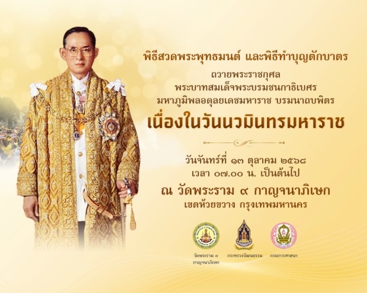 นางสาวซาบีดา ไทยเศรษฐ์ รัฐมนตรีว่าการกระทรวงวัฒนธรรม กล่าวว่า รัฐบาลได้กำหนดให้วันที่ 13 ตุลาคมของทุกปี ซึ่งเป็นวันคล้ายวันสวรรคตของพระบาทสมเด็จพระบรมชนกาธิเบศร มหาภูมิพลอดุลยเดชมหาราช บรมนาถบพิตร เป็น “วันนวมินทรมหาราช” กระทรวงวัฒนธรรม โดยกรมการศาสนา จึงกำหนดจัดพิธีสวดพระพุทธมนต์ เพื่อน้อมถวายเป็นพระราชกุศล เนื่องในวันนวมินทรมหาราช และถวายราชสดุดีแด่พระมหากษัตริย์นักพัฒนา ซึ่งกิจกรรมประกอบด้วย พิธีตักบาตรพระสงฆ์ พิธีสวดพระพุทธมนต์และสดับปกรณ์ สำหรับส่วนภูมิภาค กระทรวงวัฒนธรรม โดยกรมการศาสนา ได้ร่วมกับสำนักงานวัฒนธรรมจังหวัด 76 จังหวัด จัดโครงการหรือกิจกรรมเพื่อถวายราชสดุดีและถวายพระราชกุศล ประกอบด้วย พิธีทำบุญตักบาตรพระสงฆ์ พิธีสวดพระพุทธมนต์ กิจกรรมรักษาศีลปฏิบัติธรรม กิจกรรมจิตอาสาบำเพ็ญสาธารณประโยชน์ การจัดนิทรรศการน้อมรำลึกในพระมหากรุณาธิคุณในด้านศาสนา กิจกรรมเทิดทูนสถาบันพระมหากษัตริย์ และกิจกรรมอื่นใด ที่จังหวัดนั้น ๆ เห็นสมควร เพื่อถวายราชสดุดีและถวายพระราชกุศล