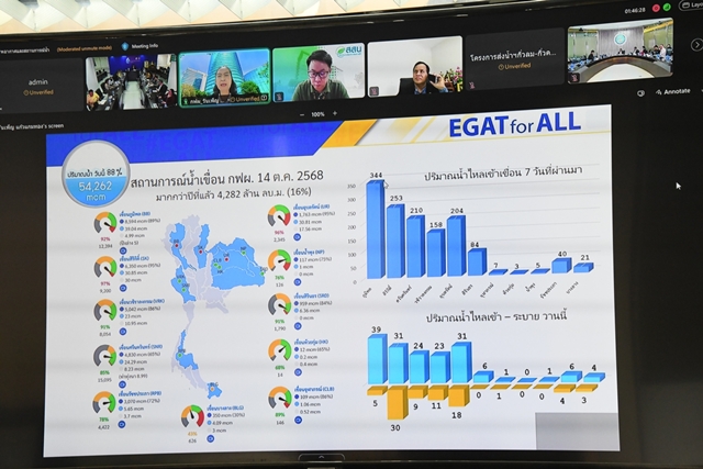 วันที่ 14 ตุลาคม 2568 นายดนุชา พิชยนันท์ เลขาธิการสำนักงานทรัพยากรน้ำแห่งชาติ (สทนช.) เป็นประธานการประชุมติดตามสถานการณ์น้ำ โดยมีผู้ทรงคุณวุฒิและผู้แทนหน่วยงานที่เกี่ยวข้อง เข้าร่วมประชุม ณ อาคารจุฑามาศ สำนักงานทรัพยากรน้ำแห่งชาติ และผ่านสื่ออิเล็กทรอนิกส์ โดยเลขาธิการ สทนช. เปิดเผยภายหลังการประชุมว่า การประชุมวันนี้ กรมอุตุนิยมวิทยาและสถาบันสารสนเทศทรัพยากรน้ำ (องค์การมหาชน) (สสน.) ได้คาดการณ์ว่า ช่วงวันที่ 15 – 16 ตุลาคม 2568 ประเทศไทยตอนบนยังคงมีฝนตกกระจายในระดับปานกลาง – หนัก บริเวณพื้นที่ภาคเหนือ ภาคตะวันออกเฉียงเหนือ ภาคกลาง รวมถึงกรุงเทพมหานครและปริมณฑล หลังจากนั้น ร่องความกดอากาศต่ำจะเริ่มเคลื่อนตัวลงทางตอนกลางและตอนใต้ของประเทศ ดังนั้น ตั้งแต่วันที่ 17 ตุลาคม 2568 จะต้องเฝ้าระวังฝนที่ตกมากขึ้นในพื้นที่ภาคใต้ โดยกรมอุตุนิยมวิทยาได้คาดการณ์ว่าประมาณปลายเดือนตุลาคมก็จะเริ่มเข้าสู่ฤดูหนาว ทำให้สถานการณ์อุทกภัยในพื้นที่ต่างๆ เริ่มคลี่คลายลง สำหรับสถานการณ์น้ำในแต่ละเขื่อนขณะนี้เริ่มควบคุมบริหารจัดการได้ ถึงแม้ว่าหลายเขื่อนจะมีปริมาณมากใกล้เต็มความจุเก็บกัก ได้แก่ เขื่อนภูมิพล เขื่อนสิริกิติ์ เขื่อนอุบลรัตน์ เป็นต้น แต่ก็สามารถปรับการระบายให้สอดคล้องกับสถานการณ์ฝน ปริมาณน้ำท่าในพื้นที่ต่าง ๆ โดยต้องกักเก็บน้ำไว้ใช้อย่างเพียงพอในฤดูแล้งด้วย ในขณะที่สถานการณ์น้ำลุ่มน้ำเจ้าพระยาปัจจุบัน มีน้ำไหลผ่านสถานี C.2 อำเภอเมืองนครสวรรค์ที่อัตรา 2,645 ลบ.ม. ต่อวินาที ระดับน้ำเหนือเขื่อนเจ้าพระยา +16.07 เมตร จากระดับทะเลปานกลาง ปัจจุบันมีการระบายน้ำเขื่อนเจ้าพระยา 2,300 ลบ.ม.ต่อวินาที