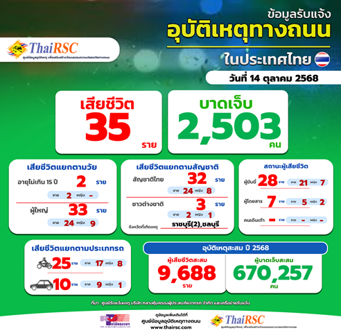 สถานการณ์อุบัติเหตุทางถนนในประเทศไทย วันที่ 14 ตุลาคม 2568