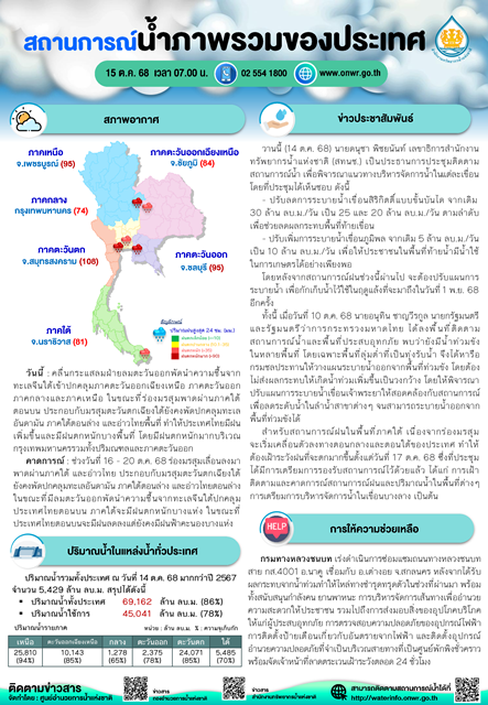 วานนี้ (14 ต.ค. 68) นายดนุชา พิชยนันท์ เลขาธิการสำนักงานทรัพยากรน้ำแห่งชาติ (สทนช.) เป็นประธานการประชุมติดตามสถานการณ์น้ำ เพื่อพิจารณาแนวทางบริหารจัดการน้ำในแต่ละเขื่อน โดยที่ประชุมได้เห็นชอบ ดังนี้