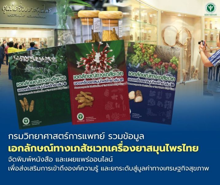 กรมวิทยาศาสตร์การแพทย์ กระทรวงสาธารณสุข เก็บรวบรวมข้อมูลเอกลักษณ์ทางเภสัชเวทของเครื่องยาสมุนไพรไทย โดยจัดพิมพ์เป็นหนังสือและเผยแพร่ผ่านโซเชียลแพลตฟอร์ม เพื่อเป็นกลไกสำคัญในการส่งเสริมการเข้าถึงองค์ความรู้ และยกระดับสู่มูลค่าทางเศรษฐกิจสุขภาพ