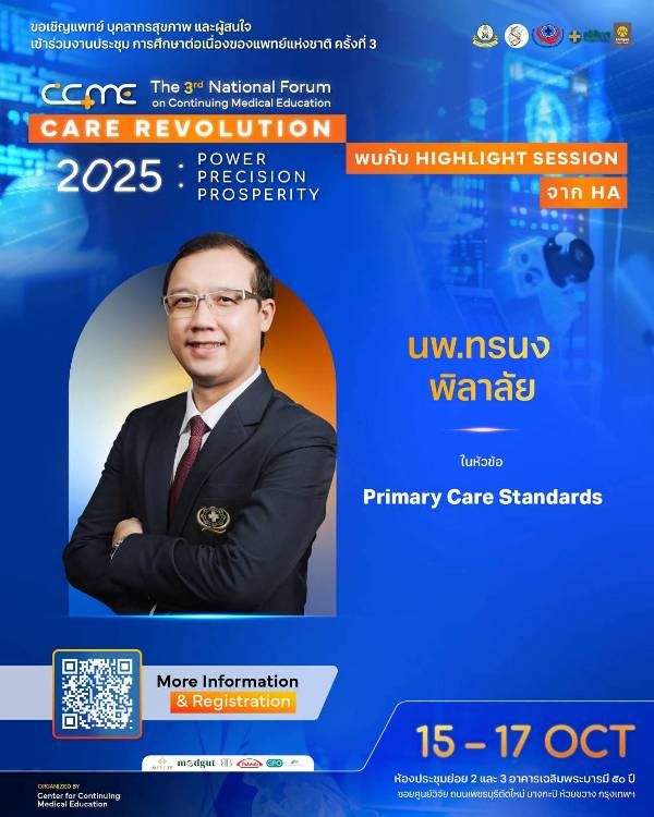 นพ.ทรนง พิลาลัย ผู้ช่วยผู้อำนวยการสถาบันรับรองคุณภาพสถานพยาบาล ร่วมเป็นวิทยากรบรรยายในหัวข้อเรื่อง Primary Care Standards ในงานประชุมการศึกษาต่อเนื่องของแพทย์แห่งชาติ ครั้งที่ 3 ประจำปี 2568 ภายใต้แนวคิด “Care Revolution 2025: Power, Precision, Prosperity” ในวันที่ 17 ตุลาคม 2568 ณ อาคารเฉลิมพระบารมี 50 ปี ซอยศูนย์วิจัย ถนนเพชรบุรีตัดใหม่ กรุงเทพฯ