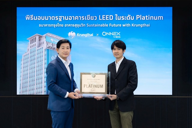 กรุงเทพมหานคร – นายบวรสันติ์ นวราช กรรมการผู้จัดการ บริษัท เอสซีจี บิลดิ้ง แอนด์ ลิฟวิ่งแคร์คอนซัลติ้ง จำกัด จาก ONNEX by SCG (ที่ 5 จากขวา) ร่วมแสดงความยินดีในพิธีมอบป้ายมาตรฐานอาคารเขียว “LEED (Leadership in Energy and Environmental Design)” ให้แก่ ธนาคารกรุงไทย อาคารสำนักงานใหญ่ สุขุมวิท นำโดย คุณพิชิตศักดิ์ ศิริปัญจนะ ผู้บริหารสายงาน ปฏิบัติการธนาคารกรุงไทย (ที่ 6 จากซ้าย) หลังประสบความสำเร็จผ่านการรับรองมาตรฐานอาคารเขียว LEED เวอร์ชันล่าสุด 4.1 ประเภท O+M ในระดับ Platinum ซึ่งเป็นระดับสูงสุด ที่มุ่งเน้นด้านการดูแลและปรับปรุงประสิทธิภาพของอาคารที่มีอยู่เดิม ให้ลดการใช้ทรัพยากรและการปล่อยก๊าซเรือนกระจกได้จริง และสร้างคุณภาพอากาศภายในอาคารที่ดีแก่ผู้ใช้งาน เพื่อดำเนินการตามเป้าหมายการมุ่งสู่ Net Zero ของธนาคารกรุงไทยในภาพรวม โดยมีผู้เชี่ยวชาญจากทาง ONNEX by SCG เป็นบริษัทที่ปรึกษาการขอรับรองมาตรฐานในครั้งนี้ ต่อเนื่องจากปี 2567 ที่อาคารสำนักงานใหญ่ นานาเหนือ ได้รับรางวัล LEED ในระดับ Gold จากสถาบัน U.S. Green Building Council (USGBC) มาก่อนหน้า