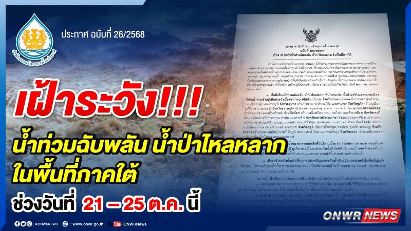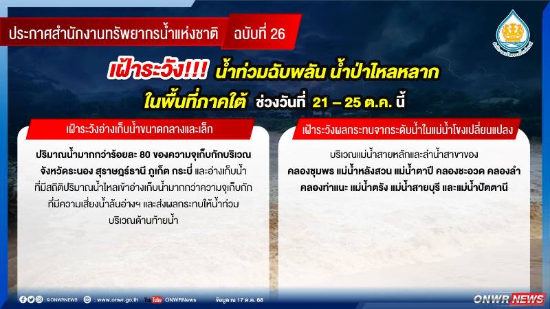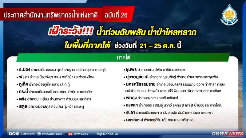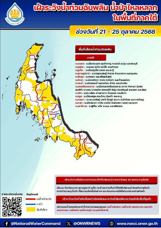 สำนักงานทรัพยากรน้ำแห่งชาติ (สทนช.) ได้ติดตามการคาดการณ์สภาพอากาศพบว่า จะมีฝนตกหนักถึงหนักมากบางแห่งในพื้นที่ภาคใต้ ทั้งนี้ สทนช. ได้ประเมินวิเคราะห์สภาพอากาศ สถานการณ์น้ำ และคาดการณ์พื้นที่เสี่ยงน้ำหลาก ดินโคลนถล่ม ร่วมกับกรมอุตุนิยมวิทยา สถาบันสารสนเทศทรัพยากรน้ำ (องค์การมหาชน) กรมทรัพยากรน้ำ กรมทรัพยากรธรณี กรมชลประทาน การไฟฟ้าฝ่ายผลิตแห่งประเทศไทย และกรมป้องกันและบรรเทาสาธารณภัย พบว่ามีพื้นที่เสี่ยงต้องเฝ้าระวังน้ำท่วมฉับพลัน น้ำป่าไหลหลาก ดินโคลนถล่ม น้ำท่วมขังในเขตชุมชนเมืองที่เกิดน้ำท่วมขังอยู่เป็นประจำ เนื่องจากระบายน้ำไม่ทัน ในช่วงวันที่ 21 – 25 ตุลาคม 2568 ดังนี้