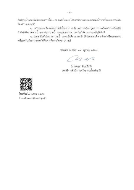 2. เฝ้าระวังอ่างเก็บน้ำขนาดกลางและเล็กที่มีปริมาณน้ำมากกว่าร้อยละ 80 ของความจุเก็บกักบริเวณ จังหวัดระนอง สุราษฎร์ธานี ภูเก็ต กระบี่ และอ่างเก็บน้ำที่มีสถิติปริมาณน้ำไหลเข้าอ่างเก็บน้ำมากกว่าความจุเก็บกัก ที่มีความเสี่ยงน้ำล้นอ่างฯ และส่งผลกระทบให้น้ำท่วมบริเวณด้านท้ายน้ำ
