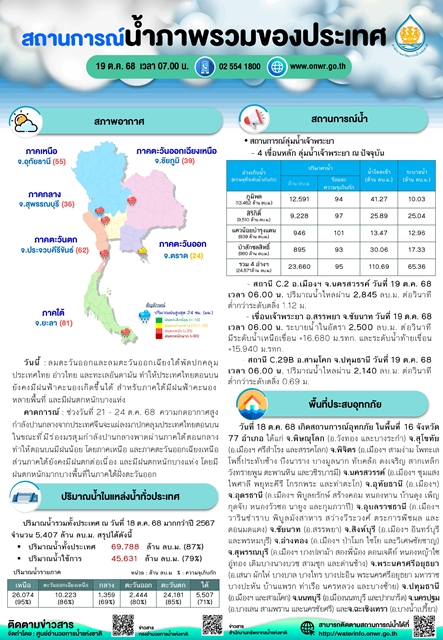 4.พื้นที่ประสบอุทกภัย: วันที่ 18 ต.ค. 68 เกิดสถานการณ์อุทกภัย ในพื้นที่ 16 จังหวัด 77 อำเภอ ได้แก่ จ.พิษณุโลก (อ.วังทอง และบางระกำ) จ.สุโขทัย (อ.เมืองฯ ศรีสำโรง และสรรคโลก) จ.พิจิตร (อ.เมืองฯ สามง่าม โพทะเล โพธิ์ประทับช้าง บึงนาราง บางมูลนาก ทับคล้อ ดงเจริญ สากเหล็ก วังทรายพูน ตะพานหิน และวชิรบารมี) จ.นครสวรรค์ (อ.เมืองฯ ชุมแสง ไพศาลี พยุหะคีรี โกรกพระ และท่าตะโก) จ.อุทัยธานี (อ.เมืองฯ) จ.อุดรธานี (อ.เมืองฯ พิบูลยรักษ์ สร้างคอม หนองหาน บ้านดุง เพ็ญ กุดจับ หนองวัวซอ นายูง และกุมภวาปี) จ.อุบลราชธานี (อ.เมืองฯ วารินชำราบ พิบูลมังสาหาร สว่างวีระวงศ์ ตระการพืชผล และดอนมดแดง) จ.ชัยนาท (อ.สรรพยา) จ.สิงห์บุรี (อ.เมืองฯ อินทร์บุรี และพรหมบุรี) จ.อ่างทอง (อ.เมืองฯ ป่าโมก ไชโย และวิเศษชัยชาญ) จ.สุพรรณบุรี (อ.เมืองฯ บางปลาม้า สองพี่น้อง ดอนเจดีย์ หนองหญ้าไซ อู่ทอง เดิมบางนางบวช สามชุก และด่านช้าง) จ.พระนครศรีอยุธยา (อ.เสนา ผักไห่ บางบาล บางไทร บางปะอิน พระนครศรีอยุธยา มหาราช บางปะหัน บ้านแพรก ท่าเรือ นครหลวง และบางซ้าย) จ.ปทุมธานี (อ.เมืองฯ และสามโคก) จ.นนทบุรี (อ.เมืองนนทบุรี และปากเกร็ด) จ.นครปฐม (อ.บางเลน สามพราน และนครชัยศรี) และจ.ฉะเชิงเทรา (อ.บางน้ำเปรี้ยว)