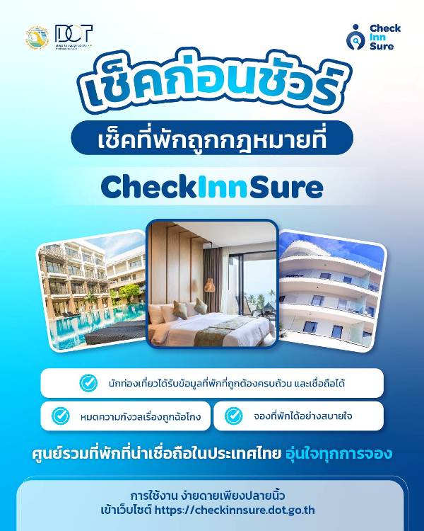 นายจาตุรนต์ ภักดีวานิช อธิบดีกรมการท่องเที่ยว เปิดเผยว่า กรมการท่องเที่ยว โดยกองพัฒนาบริการท่องเที่ยว ได้พัฒนาระบบเทคโนโลยีดิจิทัลเพื่ออำนวยความสะดวกและเพิ่มความปลอดภัยแก่นักท่องเที่ยวอย่างเป็นรูปธรรม ผ่านระบบสำคัญที่พัฒนาขึ้น ได้แก่ ระบบ Web Application “Check Inn Sure” เว็บไซต์ศูนย์รวมข้อมูลสถานที่พักที่ถูกต้องตามกฎหมาย จัดทำขึ้นเพื่อให้นักท่องเที่ยวสามารถตรวจสอบข้อมูลที่พักได้ด้วยตนเองอย่างสะดวก รวดเร็ว และปลอดภัย ช่วยลดความเสี่ยงจากการถูกหลอกลวงผ่านเว็บไซต์หรือเพจปลอม โดยนักท่องเที่ยวสามารถเข้าใช้งานได้ที่ https://checkinnsure.dot.go.th