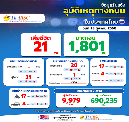 สถานการณ์อุบัติเหตุทางถนนในประเทศไทย วันที่ 23 ตุลาคม 2568 24 ตุลาคม 2025Thailandplusประชาสัมพันธ์ Facebook iconFacebookTwitter iconTwitterLINE iconLineสถานการณ์อุบัติเหตุทางถนนในประเทศไทย วันที่ 23 ตุลาคม 2568