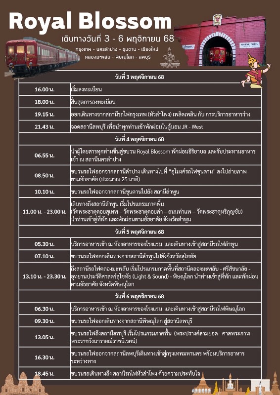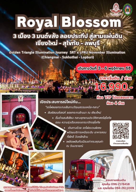 การรถไฟแห่งประเทศไทย ร่วมกับ มหาวิทยาลัยราชภัฏลำปาง เชิญคุณร่วมเดินทางบนขบวนรถไฟสุดหรู สัมผัสเสน่ห์ประวัติศาสตร์ วัฒนธรรม และความโรแมนติกของเทศกาลลอยกระทง ในราคาสุดคุ้ม ราคาเพียง 16,990 บาท/ท่าน (ตู้ Passenger Car) ส่วนตู้ VIP ที่นั่งได้เต็มเป็นที่เรียบร้อย