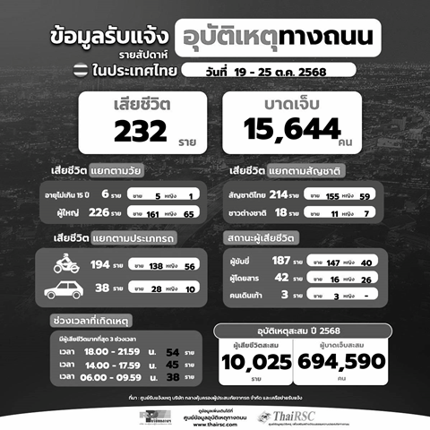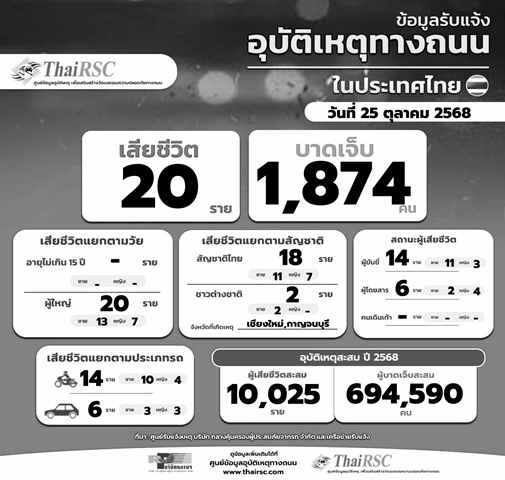 สถานการณ์อุบัติเหตุทางถนนในประเทศไทย รายสัปดาห์ 19-25 ต.ค.68 26 ตุลาคม 2025Thailandplusประชาสัมพันธ์ Facebook iconFacebookTwitter iconTwitterLINE iconLineสถานการณ์อุบัติเหตุทางถนนในประเทศไทย วันที่ 25 ตุลาคม 2568