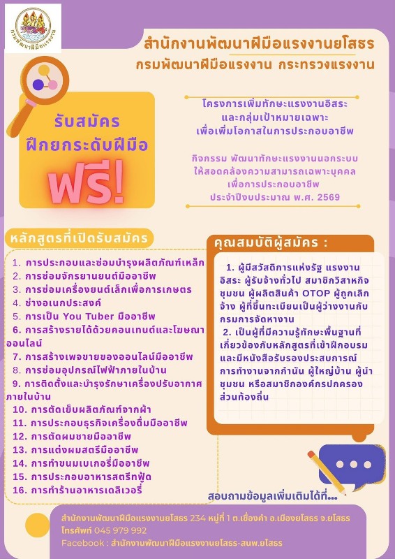 กรมพัฒนาฝีมือแรงงาน โดยสำนักงานพัฒนาฝีมือแรงงานยโสธร เดินหน้าขับเคลื่อนนโยบายกระทรวงแรงงาน ในการพัฒนาทักษะแรงงานให้พร้อมรับการเปลี่ยนแปลงของตลาดแรงงานยุคใหม่ เปิดรับสมัครฝึกอบรม โครงการเพิ่มทักษะแรงงานอิสระและกลุ่มเป้าหมายเฉพาะเพื่อเพิ่มโอกาสในการประกอบอาชีพ ภายใต้กิจกรรม “พัฒนาทักษะแรงงานนอกระบบให้สอดคล้องกับความสามารถเฉพาะบุคคลเพื่อการประกอบอาชีพ” ประจำปีงบประมาณ พ.ศ. 2569 รวมทั้งสิ้น 16 หลักสูตร ฟรี! เพื่อเสริมทักษะ เพิ่มศักยภาพ และต่อยอดสู่การมีอาชีพที่มั่นคงและยั่งยืน