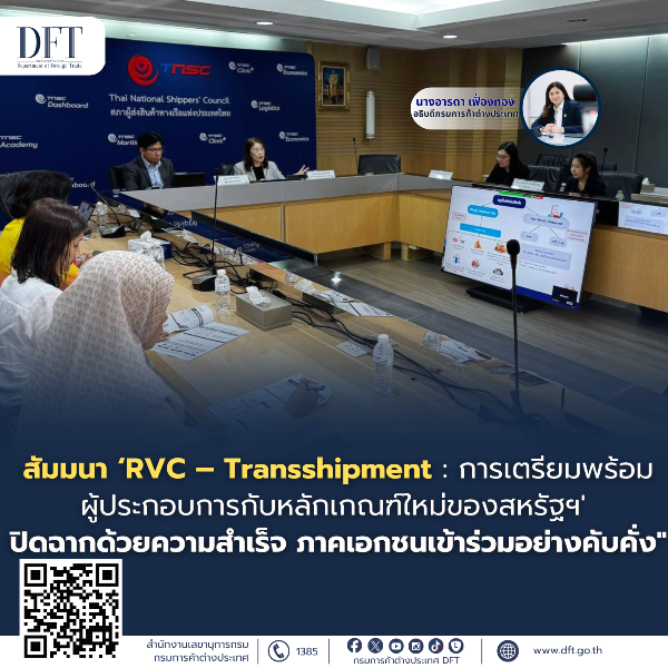 เมื่อวันที่ 21 ตุลาคม 2568 กระทรวงพาณิชย์ โดยกรมการค้าต่างประเทศ (คต.) ร่วมกับสภาผู้ส่งสินค้าทางเรือแห่งประเทศไทย (สรท.) จัดสัมมนาเชิงวิชาการในหัวข้อ “RVC – Transshipment : การเตรียมความพร้อมผู้ประกอบการกับหลักเกณฑ์ใหม่ของสหรัฐฯ” ณ สภาผู้ส่งสินค้าทางเรือแห่งประเทศไทย โดยมีผู้เข้าร่วมอบรมทั้งในรูปแบบ Onsite และผ่านระบบ Online รวมทั้งสิ้น 228 คน สะท้อนถึงความสนใจของภาคธุรกิจส่งออกที่ต้องการเตรียมความพร้อมรับมือกับมาตรการภาษีใหม่ของสหรัฐฯ โดยมีผู้ประกอบการส่งออกและผู้ที่เกี่ยวข้องจากหลายภาคส่วนเข้าร่วมอย่างคับคั่ง