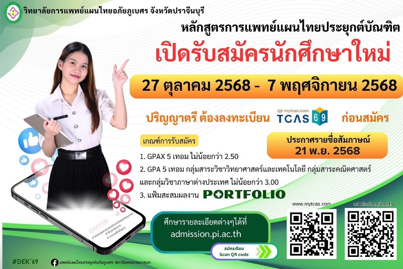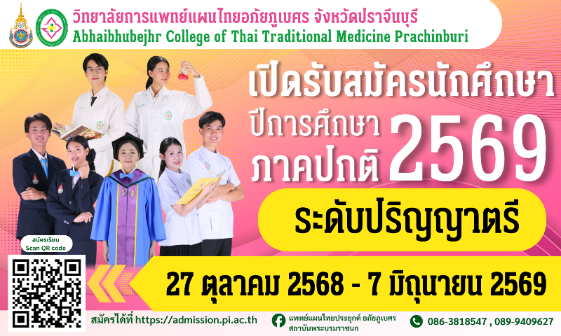 วิทยาลัยการแพทย์แผนไทยอภัยภูเบศร จังหวัดปราจีนบุรี เปิดรับสมัครนักศึกษาใหม่ ปีการศึกษา 2569 หลักสูตรการแพทย์แผนไทยประยุกต์บัณฑิต (พท.ป.บ.) / Bachelor of Applied Thai Traditional Medicine (B.A.T.M.) ระยะเวลาเรียน 4 ปี ตามแผนผลิตปกติและแผนผลิตโครงการผลิตแพทย์และทีมนวัตกรรมสุขภาพเพื่อเวชศาสตร์ครอบครัวตอบสนองต่อระบบสุขภาพปฐมภูมิทั่วไทย (9 หมอ) เพื่อสร้างโอกาสให้แก่นักเรียนในทุกพื้นที่ โดยเฉพาะในพื้นที่ห่างไกลได้เข้าศึกษาระดับอุดมศึกษาด้านวิทยาศาสตร์สุขภาพเพื่อตอบสนองความต้องการกำลังคนด้านสุขภาพของสถานบริการทั่วประเทศ รวมถึงการผลิตบัณฑิตคืนถิ่นจากชุมชนกลับไปปฏิบัติงานในระบบสุขภาพปฐมภูมิ ผู้สนใจ สามารถสมัครออนไลน์ที่ https://admission.pi.ac.th หรือสอบถามรายละเอียดได้ที่ โทร. 037-454-470 ต่อ 25, 089-904-9627, 081-381-8547Facebook: แพทย์แผนไทยประยุกต์ อภัยภูเบศร สถาบันพระบรมราชชนก อีเมล: education_service@acttm.ac.th