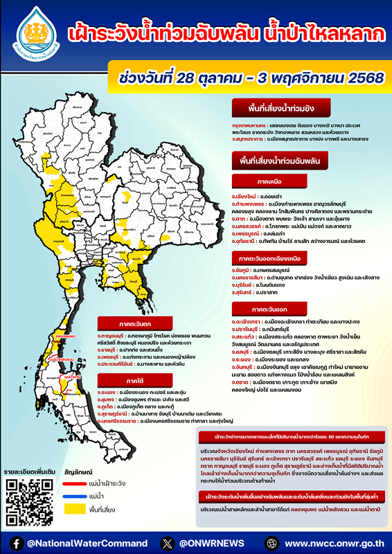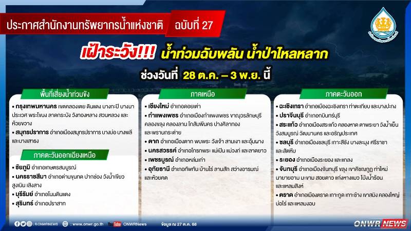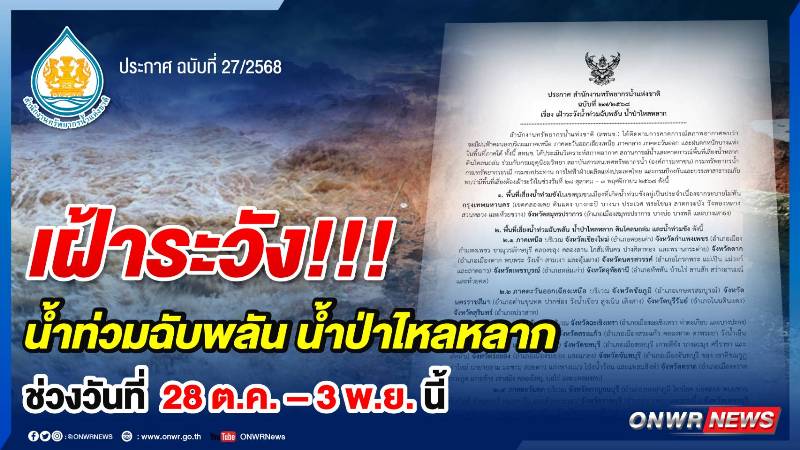 เฝ้าระวัง!!! น้ำท่วมฉับพลัน น้ำป่าไหลหลาก ช่วงวันที่ 28 ต.ค. – 3 พ.ย.68 นี้