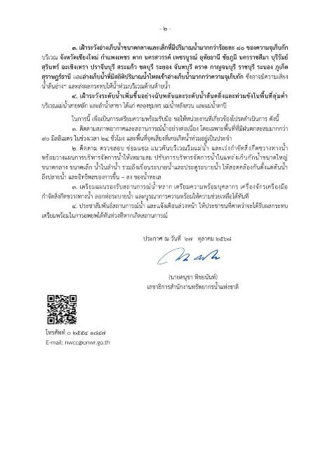 3. เฝ้าระวังอ่างเก็บน้ำขนาดกลางและเล็กที่มีปริมาณน้ำมากกว่าร้อยละ 80 ของความจุเก็บกักบริเวณ จังหวัดเชียงใหม่ กำแพงเพชร ตาก นครสวรรค์ เพชรบูรณ์ อุทัยธานี ชัยภูมิ นครราชสีมา บุรีรัมย์ สุรินทร์ ฉะเชิงเทรา ปราจีนบุรี สระแก้ว ชลบุรี ระยอง จันทบุรี ตราด กาญจนบุรี ราชบุรี ระนอง ภูเก็ต สุราษฎร์ธานี และอ่างเก็บน้ำที่มีสถิติปริมาณน้ำไหลเข้าอ่างเก็บน้ำมากกว่าความจุเก็บกัก ซึ่งอาจมีความเสี่ยงน้ำล้นอ่างฯ และส่งผลกระทบให้น้ำท่วมบริเวณด้านท้ายน้ำ