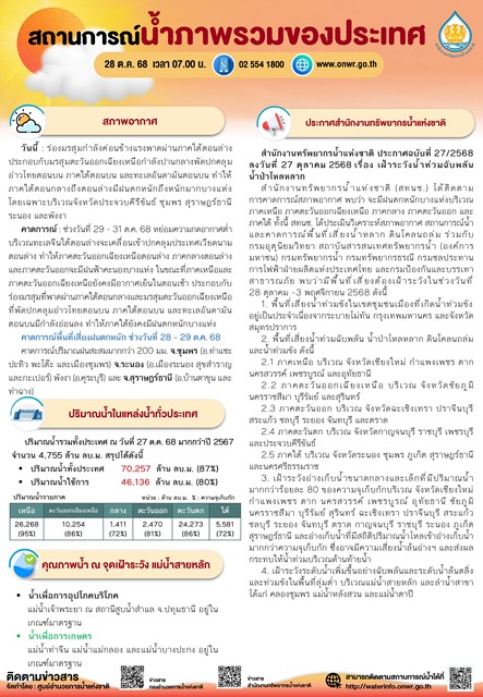 สำนักงานทรัพยากรน้ำแห่งชาติ ประกาศฉบับที่ 27/2568 ลงวันที่ 27 ตุลาคม 2568 เรื่อง เฝ้าระวังน้ำท่วมฉับพลัน น้ำป่าไหลหลาก