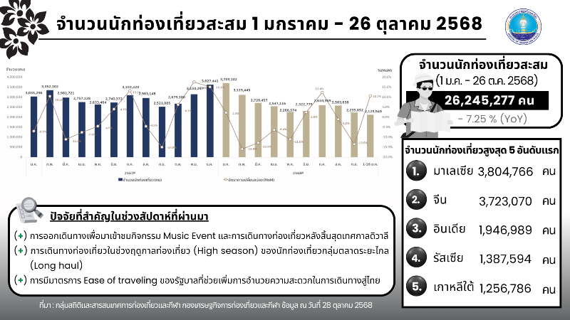 สรุปภาพรวมการท่องเที่ยวในสัปดาห์นี้ โดยข้อมูล ณ วันที่ 27 ต.ค. 68 พบว่า ประเทศไทย มีจำนวนนักท่องเที่ยวชาวต่างชาติสะสมตั้งแต่วันที่ 1 ม.ค. – 26 ต.ค. 68 ที่ผ่านมาทั้งสิ้น 26,245,277 คน สร้างรายได้จากการใช้จ่ายของนักท่องเที่ยวต่างชาติแล้วประมาณ 1,211,816 ล้านบาท โดยจำนวนนักท่องเที่ยวสูงสุด 5 อันดับแรก ได้แก่ มาเลเซีย (3,804,766 คน) จีน (3,723,070 คน) อินเดีย (1,946,989 คน) รัสเซีย (1,387,594 คน) และเกาหลีใต้ (1,256,786 คน)