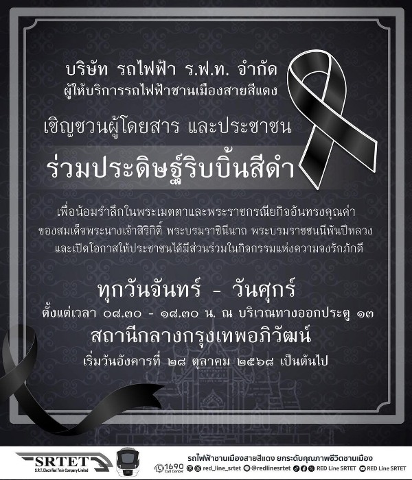 นายสุเทพ พันธุ์เพ็ง กรรมการผู้อำนวยการใหญ่ บริษัท รถไฟฟ้า ร.ฟ.ท. จำกัด ผู้ให้บริการรถไฟฟ้าชานเมืองสายสีแดง เปิดเผยว่า รฟฟท. ถือเป็นหน่วยงานที่รับใช้ใต้เบื้องพระยุคลบาท และน้อมนำแนวพระราชดำริ พระราชปณิธาน และพระบรมราโชบายของพระบาทสมเด็จพระบรมชนกาธิเบศร มหาภูมิพลอดุลยเดชมหาราช บรมนาถบพิตร และสมเด็จพระนางเจ้าสิริกิติ์ พระบรมราชินีนาถ พระบรมราชชนนีพันปีหลวง มาอย่างยาวนาน ในโอกาสนี้จึงขอเชิญชวนผู้โดยสาร และประชาชนทั่วไป ร่วมประดิษฐ์ริบบิ้นสีดำ เพื่อแสดงออกถึงความจงรักภักดี น้อมรำลึกในพระเมตตาและพระราชกรณียกิจอันทรงคุณค่า ของสมเด็จพระนางเจ้าสิริกิติ์ พระบรมราชินีนาถ พระบรมราชชนนีพันปีหลวง โดยสามารถเข้าร่วมประดิษฐ์ริบบิ้นสีดำ ได้ทุกวันจันทร์ – วันศุกร์ เริ่มวันอังคารที่ 28 ตุลาคม 2568 เป็นต้นไป ตั้งแต่เวลา 08.30 – 18.30 น. ณ บริเวณทางออกประตู 13 สถานีกลางกรุงเทพอภิวัฒน์