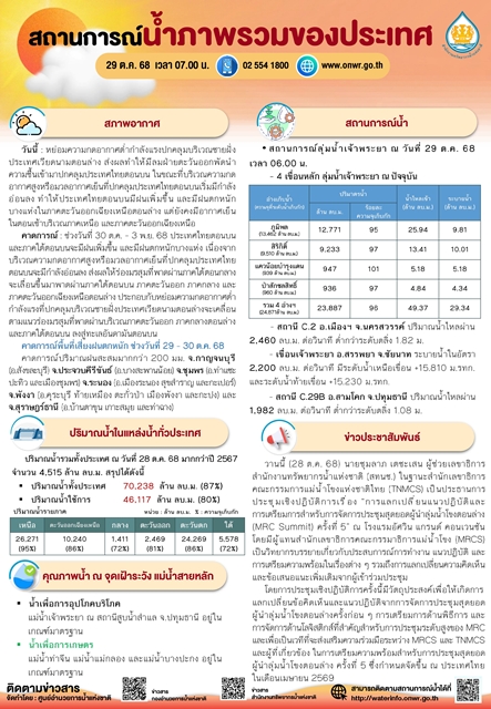 • สถานการณ์ลุ่มน้ำเจ้าพระยา ณ วันที่ 29 ต.ค. 68 เวลา 06.00 น.
