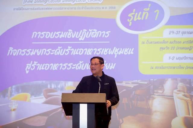 ดร.พลาวุธ วงศ์วิวัฒน์ รองเลขาธิการคณะกรรมการอ้อยและน้ำตาลทราย ช่วยปฏิบัติราชการกรมส่งเสริมอุตสาหกรรม ปฏิบัติหน้าที่ผู้อำนวยการกองพัฒนาอุตสาหกรรมชุมชน กระทรวงอุตสาหกรรม เป็นประธานเปิดการอบรมเชิงปฏิบัติการหลักสูตร กิจกรรมยกระดับร้านอาหารเชฟชุมชนสู่ร้านอาหาระดับพรีเมียม (Fine Dining/Casual Dining/Local Cuisine) ภายใต้โครงการส่งเสริมซอฟต์พาวเวอร์สาขาอาหาร รุ่นที่ 1 ซึ่ง กรมส่งเสริมอุตสาหกรรม ร่วมกับ สถาบันวิจัยวิทยาศาสตร์และเทคโนโลยีแห่งประเทศไทย (วว.) กระทรวงการอุดมศึกษา วิทยาศาสตร์ วิจัยและนวัตกรรม (อว.) จัดขึ้นระหว่างวันที่ 29-31 ตุลาคม 2568 ณ โรงแรมแบงค็อก แมริออท มาร์คีส์ ควีนส์ปาร์ค สุขุมวิท 22 กรุงเทพฯ