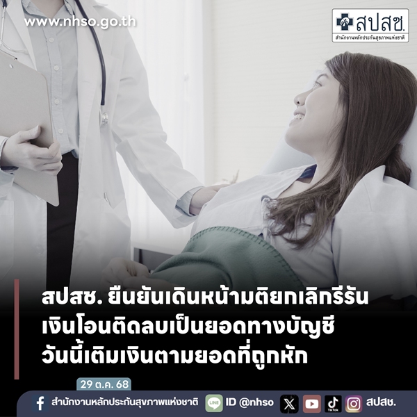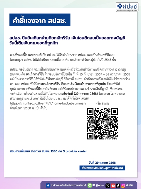 สปสช. ขอยืนยันว่า ขณะนี้ได้ดำเนินการตามมติที่หารือร่วมกับสำนักงานปลัดกระทรวงสาธารณสุข (สป.สธ.) คือ ยกเลิกการรีรัน ในรอบบริการผู้ป่วยใน วันที่ 15 กันยายน 2567 – 31 กรกฎาคม 2568 แต่เนื่องจากการรีรันได้ทำไปแล้วในทางบัญชี วิธีการที่ สปสช. ดำเนินการหลังจากได้มีมติร่วมระหว่าง สธ. และ สปสช. ที่ให้มีการยกเลิกการรีรัน คือการเติมเงินลงไปตามยอดที่ถูกหัก ซึ่งจะทำให้ทุกโรงพยาบาลที่ขณะนี้มียอดเงินติดลบ จะได้รับงบประมาณตามจำนวนเงินที่ถูกหัก ซึ่ง สปสช. จะดำเนินการโอนเงินส่วนนี้ให้กับโรงพยาบาลในวันนี้ (29 ตุลาคม 2568) โดยแต่ละโรงพยาบาลสามารถดูรายละเอียดการได้รับโอนงบประมาณได้ที่เว็บไซต์ สปสช.https://smt.nhso.go.th/smtf/#/home/budget/summary ตั้งแต่เวลา 22.00 น. เป็นต้นไป