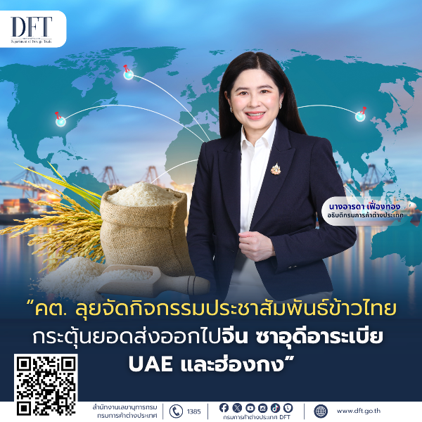 “ในเดือนพฤศจิกายน 2568 กรมการค้าต่างประเทศเตรียมจัดคณะผู้แทนเดินทางไปเข้าร่วมงานมหกรรมแสดงสินค้านานาชาติของจีน ณ นครเซี่ยงไฮ้ งาน Foodex Saudi 2025 ณ เมืองเจดดาห์ ประเทศซาอุดีอาระเบีย และงาน Thai Select Festival 2025 ณ เมืองดูไบ สหรัฐอาหรับเอมิเรตส์ รวมทั้งการจัดกิจกรรมรับรองคณะผู้นำเข้าข้าวฮ่องกงเดินทางเยือนประเทศไทย เพื่อเร่งประชาสัมพันธ์ภาพลักษณ์ข้าวไทยและสร้างความตระหนักให้ผู้บริโภคข้าวในต่างประเทศโดยชูแคมเปญ “Think Rice Think Thailand” ตอบรับกับนโยบาย รักษาตลาดเดิมและขยายตลาดใหม่ ของรัฐมนตรีว่าการกระทรวงพาณิชย์”