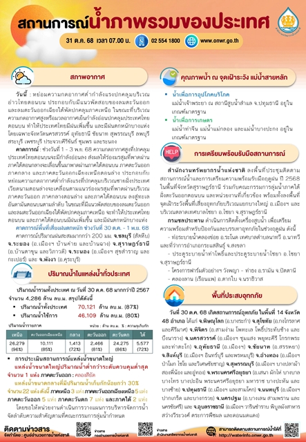 5. พื้นที่ประสบอุทกภัย : วันที่ 30 ต.ค. 68 เกิดสถานการณ์อุทกภัย ในพื้นที่ 14 จังหวัด 48 อำเภอ ได้แก่ จ.พิษณุโลก (อ.บางระกำ) จ.สุโขทัย (อ.กงไกรลาศ และคีรีมาศ) จ.พิจิตร (อ.สามง่าม โพทะเล โพธิ์ประทับช้าง และบึงนาราง) จ.นครสวรรค์ (อ.เมืองฯ ชุมแสง พยุหะคีรี โกรกพระ และท่าตะโก) จ.อุทัยธานี (อ.เมืองฯ) จ.ชัยนาท (อ.สรรพยา) จ.สิงห์บุรี (อ.เมืองฯ อินทร์บุรี และพรหมบุรี) จ.อ่างทอง (อ.เมืองฯ ป่าโมก ไชโย และวิเศษชัยชาญ) จ.สุพรรณบุรี (อ.เมืองฯ บางปลาม้า สองพี่น้อง และอู่ทอง) จ.พระนครศรีอยุธยา (อ.เสนา ผักไห่ บางบาล บางไทร บางปะอิน พระนครศรีอยุธยา มหาราช บางปะหัน และบางซ้าย) จ.ปทุมธานี (อ.เมืองฯ และสามโคก) จ.นนทบุรี (อ.เมืองฯ ปากเกร็ด และบางกรวย) จ.นครปฐม (อ.บางเลน สามพราน และนครชัยศรี) และ จ.อุบลราชธานี (อ.เมืองฯ วารินชำราบ พิบูลมังสาหาร สว่างวีระวงศ์ ตระการพืชผล และดอนมดแดง)