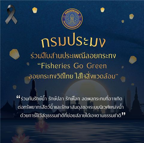 กรมประมง…ขอเชิญชวนพี่น้องประชาชนร่วมสืบสานประเพณีลอยกระทง ภายใต้แนวคิด “Fisheries Go Green ลอยกระทงวิถีไทย ใส่ใจสิ่งแวดล้อม” ร่วมกันรักษ์น้ำ รักษ์ปลา รักษ์โลก ลดผลกระทบที่อาจเกิดต่อทรัพยากรสัตว์น้ำและรักษาสมดุลของระบบนิเวศแหล่งน้ำ ด้วยการใช้วัสดุธรรมชาติที่ย่อยสลายได้เองตามธรรมชาติ
