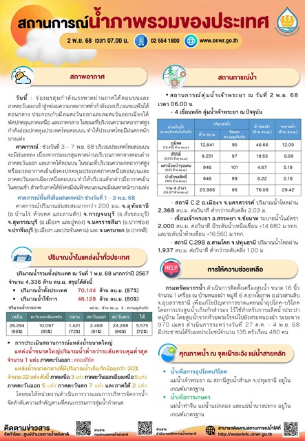 • สถานการณ์ลุ่มน้ำเจ้าพระยา ณ วันที่ 2 พ.ย. 68 เวลา 06.00 น.