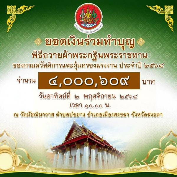 วันที่ 2 พฤศจิกายน 2568 เวลา 10.00 น. – เรือเอก สาโรจน์ คมคาย อธิบดีกรมสวัสดิการและคุ้มครองแรงงาน (กสร.) เป็นประธานในพิธีถวายผ้าพระกฐินพระราชทานกรมสวัสดิการและคุ้มครองแรงงาน ประจำปี 2568 ในโอกาสที่พระบาทสมเด็จพระเจ้าอยู่หัว ทรงพระกรุณาโปรดเกล้าโปรดกระหม่อม พระราชทานผ้าพระกฐิน ตามที่กรมสวัสดิการและคุ้มครองแรงงานขอพระราชทาน เพื่อนำไปทอดถวาย ณ วัดมัชฌิมาวาส ตำบลบ่อยาง อำเภอเมืองสงขลา จังหวัดสงขลา โดยมี นายโชตินรินทร์ เกิดสม ผู้ว่าราชการจังหวัดสงขลาและภริยา คณะผู้บริหาร ข้าราชการ และเจ้าหน้าที่กรมสวัสดิการและคุ้มครองแรงงาน พุทธศาสนิกชนและประชาชนในพื้นที่เข้าร่วมพิธีอย่างพร้อมเพรียง และมีพระราชศีลสังวร (ผ่อง จิรธมฺโม) เจ้าอาวาสวัดมัชฌิมาวาส วรวิหาร เป็นประธานฝ่ายสงฆ์ ทั้งนี้ ผู้มีจิตศรัทธาร่วมถวายจตุปัจจัยเพื่อทำนุบำรุงพระพุทธศาสนา รวมทั้งสิ้น 4,000,609 บาท