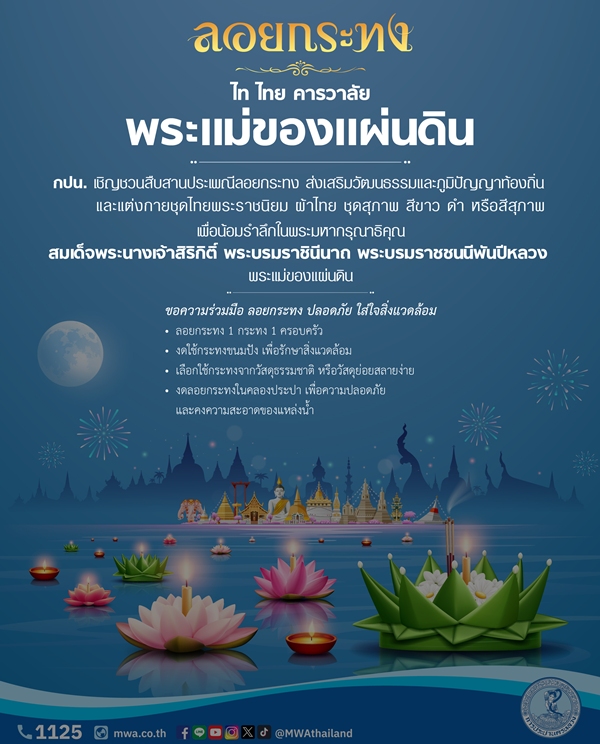 นายกิตติ ศรีพรหมมุนี ผู้อำนวยการฝ่ายสื่อสารองค์กร การประปานครหลวง (กปน.) กล่าวว่า ในเทศกาลลอยกระทง ซึ่งตรงกับวันพุธที่ 5 พฤศจิกายน 2568 กปน. ขอเชิญชวนประชาชนร่วมส่งเสริมประเพณีที่ดีงามภายใต้แนวคิด “ลอยกระทง ไท ไทย คารวาลัย พระแม่ของแผ่นดิน” โดยมุ่งเน้นสนับสนุนให้แต่ละพื้นที่จัดกิจกรรมลอยกระทงตามอัตลักษณ์ที่สะท้อนภูมิปัญญาท้องถิ่น ให้ชุมชนได้แสดงออกทางวัฒนธรรม สร้างอาชีพ สร้างรายได้ แก่ท้องถิ่นอย่างยั่งยืน ตลอดจน คำนึงถึงสิ่งแวดล้อม งดใช้กระทงขนมปัง ร่วมกันใช้กระทงที่ทำจากวัสดุย่อยสลายง่าย เป็นมิตรต่อสิ่งแวดล้อม โดยใช้แนวทาง 1 กระทง 1 ครอบครัว สร้างจิตสำนึกรักษาความสะอาดให้แหล่งน้ำ ช่วยกันกำจัดและลดขยะตามแนวคิด Zero Waste เพื่อรักษาสิ่งแวดล้อมและคำนึงถึงความปลอดภัย ตลอดจนส่งเสริมให้ประเพณีลอยกระทงเป็นมรดกภูมิปัญญาทางวัฒนธรรมเพื่อเพิ่มมูลค่าทางเศรษฐกิจของชุมชนและประเทศ และขอเชิญชวนแต่งกายชุดไทยพระราชนิยม ผ้าไทย ชุดสุภาพ สีขาว ดำ หรือสีสุภาพ เข้าร่วมงาน เพื่อน้อมรำลึกในพระมหากรุณาธิคุณ สมเด็จพระนางเจ้าสิริกิติ์ พระบรมราชินีนาถ พระบรมราชชนนีพันปีหลวง พระแม่ของแผ่นดิน