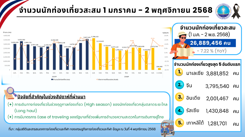 สรุปภาพรวมการท่องเที่ยวในสัปดาห์นี้ โดยข้อมูล ณ วันที่ 3 พ.ย. 68 พบว่า ประเทศไทยมีจำนวนนักท่องเที่ยวชาวต่างชาติสะสมตั้งแต่วันที่ 1 ม.ค. – 2 พ.ย. 68 ที่ผ่านมาทั้งสิ้น 26,889,456 คน สร้างรายได้จากการใช้จ่ายของนักท่องเที่ยวต่างชาติแล้วประมาณ 1,242,365 ล้านบาท โดยจำนวนนักท่องเที่ยวสูงสุด 5 อันดับแรก ได้แก่ มาเลเซีย (3,881,852 คน) จีน (3,795,540 คน) อินเดีย (2,001,467 คน) รัสเซีย (1,430,848 คน) และเกาหลีใต้ (1,281,701 คน)