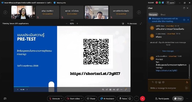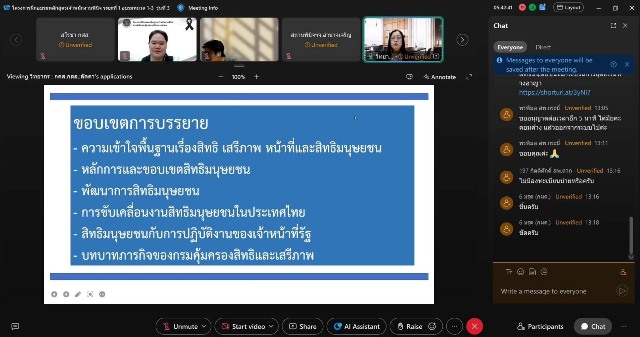 วันพุธที่ 5 พฤศจิกายน 2568 เวลา 13.00 – 16.30 น. ณ ห้องประชุมชั้น 6 อธิบดีกรมคุ้มครองสิทธิและเสรีภาพ มอบหมายให้กองส่งเสริมสิทธิและเสรีภาพ โดยนางสาวลัดดา คำทิพย์ นักวิชาการยุติธรรมชำนาญการ รักษาการในตำแหน่ง หัวหน้ากลุ่มพัฒนาระบบส่งเสริมและป้องกันและเจ้าหน้าที่กองส่งเสริมสิทธิและเสรีภาพ เข้าร่วมเป็นวิทยากรให้ความรู้ด้านสิทธิเสรีภาพและสิทธิมนุษยชน ตามโครงการอบรมหลักสูตรเจ้าพนักงานพินิจ รุ่นที่ 3 ในหัวข้อ “สิทธิมนุษยชนในกระบวนการยุติธรรมทางอาญา” ให้แก่บุคลากรในสังกัดกรมพินิจและคุ้มครองเด็กและเยาวชน จำนวน 361 คน ในรูปแบบออนไลน์ ผ่านโปรแกรม Webex