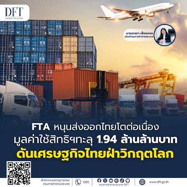 นางอารดา เฟื่องทอง อธิบดีกรมการค้าต่างประเทศ เปิดเผยว่าในช่วง 8 เดือนของปี 2568 มูลค่าการใช้สิทธิประโยชน์ทางการค้าภายใต้ความตกลงการค้าเสรี (FTA) ของไทยยังขยายตัวต่อเนื่อง โดยมีมูลค่ารวม 60,245.93 ล้านดอลลาร์สหรัฐ เพิ่มขึ้นจากช่วงเดียวกันของปีก่อนหน้า 8.40% โดยเป็นการส่งออกไปยังอาเซียนภายใต้ความตกลงการค้าสินค้าของอาเซียน (ATIGA) สูงที่สุดเป็น อันดับหนึ่ง มูลค่า 21,117.59 ล้านดอลลาร์สหรัฐ มีสัดส่วนการใช้สิทธิ 68.69% อันดับสองเป็นการใช้สิทธิฯ ภายใต้ความตกลงการค้าเสรีอาเซียน-จีน (ACFTA) มูลค่า 17,354.43 ล้านดอลลาร์สหรัฐ สัดส่วนการใช้สิทธิฯ 93.99% อันดับสาม ความตกลงการค้าเสรีอาเซียน-อินเดีย (AIFTA) มูลค่า 6,895.92 ล้านดอลลาร์สหรัฐ สัดส่วนการใช้สิทธิฯ 74.53% อันดับสี่ ความตกลงหุ้นส่วนทางเศรษฐกิจไทย-ญี่ปุ่น (JTEPA) มูลค่า 4,628.99 ล้านดอลลาร์สหรัฐ สัดส่วนการใช้สิทธิฯ 84.05% และอันดับห้า ความตกลงการค้าเสรีไทย-ออสเตรเลีย (TAFTA) มูลค่า 3,625.78 ล้านดอลลาร์สหรัฐ สัดส่วนการใช้สิทธิฯ 56.12% สินค้าที่มีการขอใช้สิทธิ FTA สูงสุด 5 อันดับแรก ได้แก่ (1) ยานยนต์สำหรับขนส่งของ (2) ทุเรียนสด (3) ยางสังเคราะห์ผสมยางธรรมชาติ (4) แพลทินัมยังไม่ได้ขึ้นรูป (อันรอต) และ (5) เนื้อไก่ปรุงแต่ง ตามลำดับ โดยตลาดจีนยังคงเป็นฐานสำคัญของสินค้าเกษตรไทย และ “ทุเรียน” ยังคงครองแชมป์สินค้าขอใช้สิทธิสูงสุดต่อเนื่อง ขณะที่ตลาดอินเดียมีการขยายตัวโดดเด่นในสินค้ากลุ่มเครื่องเพชรพลอยและแพลทินัม
