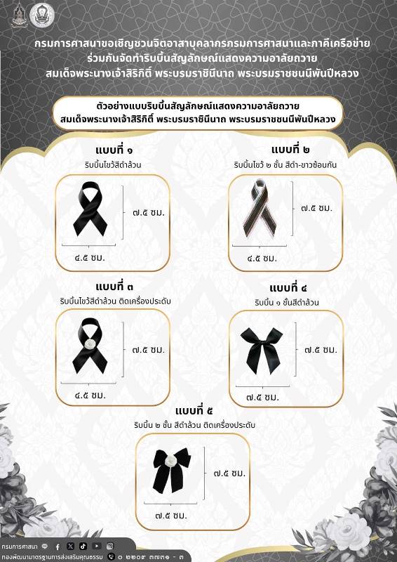 นางสาวซาบีดา ไทยเศรษฐ์ รัฐมนตรีว่าการกระทรวงวัฒนธรรม กล่าวว่า กรมการศาสนา กระทรวงวัฒนธรรม จัดกิจกรรมจิตอาสาจัดทำ “ริบบิ้นสัญลักษณ์แสดงความอาลัย” เพื่อถวายความอาลัยและน้อมรำลึกในพระมหากรุณาธิคุณของสมเด็จพระนางเจ้าสิริกิติ์ พระบรมราชินีนาถ พระบรมราชชนนีพันปีหลวง ภายหลังจากสำนักพระราชวังประกาศการเสด็จสวรรคต เมื่อวันที่ 24 ตุลาคม 2568 เป็นการแสดงออกถึงความอาลัยและสำนึกในพระมหากรุณาธิคุณที่ทรงมีต่อประเทศชาติและพสกนิกรชาวไทยในทุกด้าน ทั้งด้านศาสนา การศึกษา ศิลปาชีพ การพัฒนาคุณภาพชีวิต การอนุรักษ์วัฒนธรรมไทย และเปิดโอกาสให้ข้าราชการ บุคลากรกระทรวงวัฒนธรรม และภาคีเครือข่ายทางศาสนา ตลอดจนประชาชนทุกหมู่เหล่า ได้ร่วมแสดงออกถึงความจงรักภักดี ความกตัญญูกตเวที และน้อมรำลึกในพระมหากรุณาธิคุณอย่างหาที่สุดมิได้
